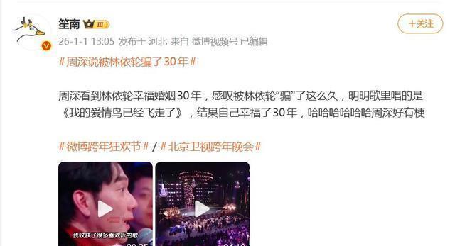 跨年夜的舞台上,周深一句“我被骗了这么久!”,瞬间把一场经典重绎变成了欢乐的“打假现场”。原来,他刚刚深情唱完林依轮的经典苦情歌《爱情鸟》,转头就发现原唱本人正拥有着一段长年的幸福婚姻——这戏剧性反差,让吃瓜群众和周深一起“破防”了。 12日北京卫视的跨年晚会上,周深在演绎完那首脍炙人口的《爱情鸟》后,得知林依轮与妻子西华已相濡以沫三十年,当场开启了精准吐槽模式:“原来林老师唱着‘我的爱情鸟已经飞走了’,结果自己的爱情鸟根本没飞走,还幸福年!我被骗了这么久!”这番“贴脸开大”式的调侃,直接戳破了歌曲伤感氛围与歌手美满现实之间的“次元壁”,被网友笑称为“乐坛年度最大发现”。